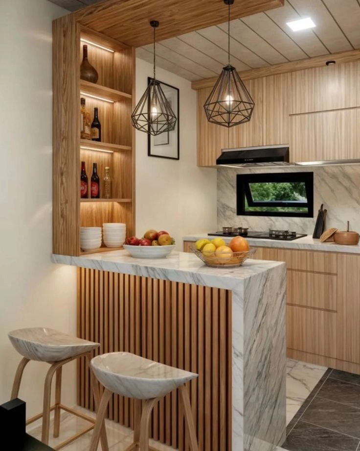 «ماروودا» جزیرهای لوکس است که با ساختار کامل MDF ساخته میشود؛ سطح کار و بدنهی بیرونی با صفحات لمینیت طرح مرمر سفید-طوسی پوشانده شده و در پیشانی از پانلهای شیاردار روکش چوب بلوط بهره میگیرد. طبقهبندی جانبی با نور مخفی LED جای مناسب بطری، ظروف دکوری یا اسنکهای عصرانه را فراهم میکند. کانتر در ارتفاع بار (۱۰۵ سانتیمتر) طراحی شده تا با دو صندلی مرتفع همنشین شود و فضایی گرم برای صبحانه یا سرو نوشیدنی خلق کند. ترکیب تضاد مرمرِ سرد و چوبِ گرم، حس استودیویی مدرن و در عین حال صمیمی به آشپزخانه میدهد.