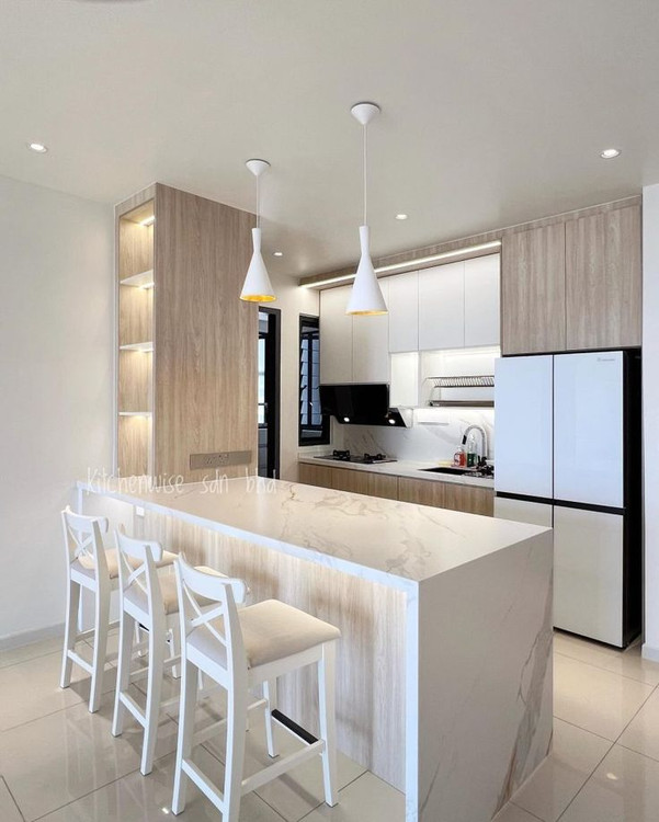 «مارمارو» جزیرهای تمام MDF است که صفحه و کنارههای آن با لمینیت طرح مرمر کالاکاتای روشن پوشانده شده و به سبک Waterfall تا کف امتداد مییابد؛ در نتیجه، حجمی مجسمهوار و یکپارچه در مرکز آشپزخانه پدید میآورد. سطح کار دوبل ۴۰ میلیمتری برای آمادهسازی غذا و سرو نوشیدنی ایدهآل است و اورهنگ ۳۰ سانتیمتری جای نشیمن سه صندلی بار را فراهم میکند. در جبههٔ داخلی، پانلهای MDF با روکش بلوط روشن حس گرمی به تضاد سفیدِ مرمر افزوده و هماهنگی کاملی با کابینتهای زمینه ایجاد میکند. فضای ذخیرهسازی مخفی (کشو و کمد Push-to-Open) تمام لوازم آشپزی را دور از دید نگه میدارد،